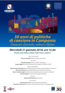 Il 31 gennaio, alle 15:00, si terrà, sempre presso la Multimidia Valley, il convegno sul bilancio delle politiche di coesione in Campania e nel Mezzogiorno. Un evento per celebrare i trenta anni di politiche di coesione in Campania alla presenza del Ministro per la Coesione territoriale e il Mezzogiorno, Claudio De Vincenti, e il Presidente della Regione Campania, Vincenzo De Luca.