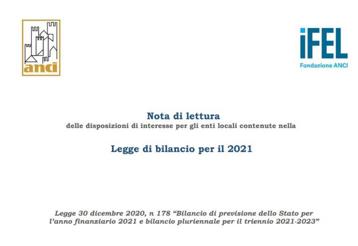 Pubblichiamo la nota di lettura Anci-IFEL sulle norme di maggior interesse per gli enti locali, contenute nella Legge di bilancio 2021 (30 dicembre 2020, n. 178).