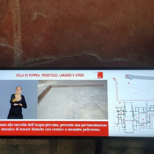 L’inaugurazione. Lo scorso 1° dicembre un nutrito gruppo di visitatori sordi provenienti da diversi angoli della Campania ha fruito – per la prima volta e senza l’ausilio di traduttori in presenza – delle magnifiche ricchezze archeologiche di Pompei e, nello specifico, di Villa Poppea (Scavi di Oplontis a Torre Annunziata), villa residenziale risalente alla metà del I secolo a.C. e probabilmente appartenuta a Poppaea Sabina, seconda moglie dell’imperatore Nerone.