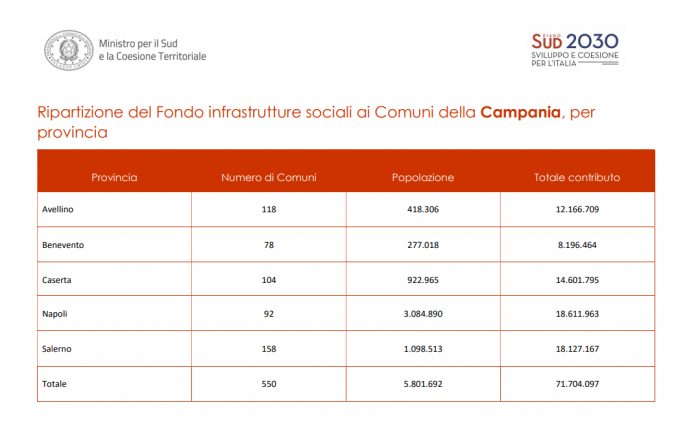 Questi fondi scaturiscono dalla Legge 27 dicembre 2019, n. 160 che ai comma 311 e 312 dell’art 1 avevano fissato uno stanziamento per i comuni situati nel territorio delle regioni Abruzzo, Basilicata, Calabria, Campania, Molise, Puglia, Sardegna e Sicilia da destinare a investimenti in infrastrutture sociali.